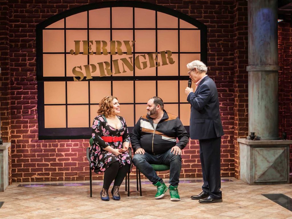 When the show starts, you probably forgot that this is going to be an opera, so when the ensemble begins to sing, you’re floored because you were expecting some outrageous Jerry Springer melodrama, and it’s only heightened by the actual singing of lyrics like “Talk to the ass…”. It’s a wacky and fun mix of styles that really adds interesting layers to the comedy.